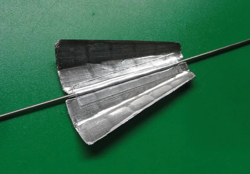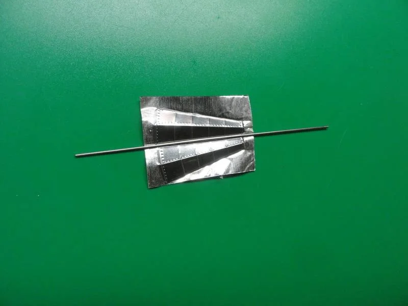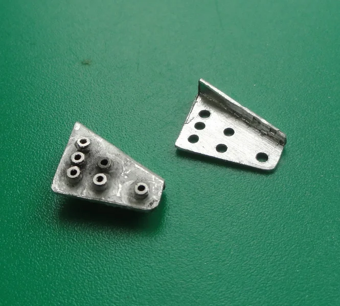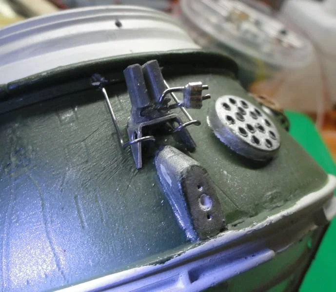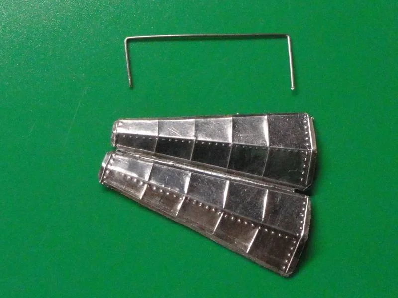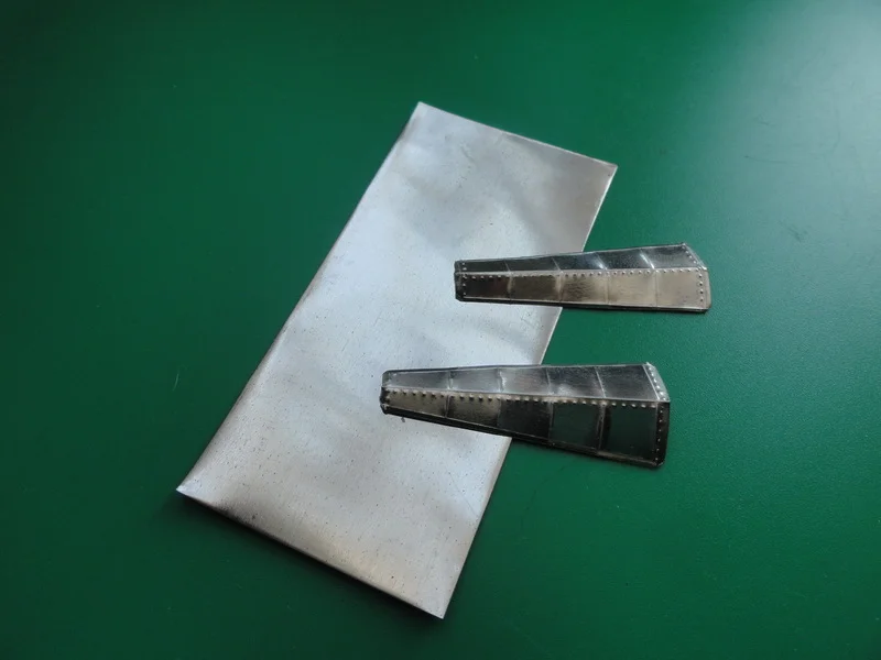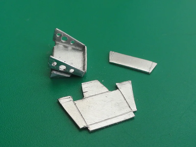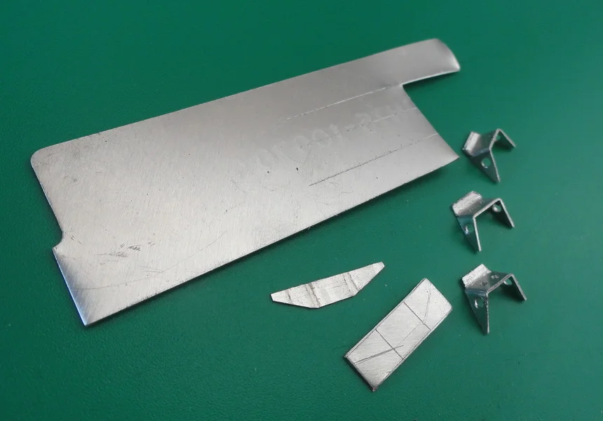 Для изготовления полок взял алюминиевую пластину (какая то деталь от монитора старого компа), толщиной 0.4мм, из жести вырезал шаблон, подогнал его по месту на корпусе, а затем по нему вырезал 4 заготовки для полок под двигатели закрутки. При помощи пассатижей и пинцета произвел гибку заготовки по разметке, затем просверлил в них отверстия, необходимые в дальнейшем при монтаже трубопроводов. Подобным образом изготовил также полки под двигатели тангажа и для системы воздухораспределения. Корпуса элементов автоматики вырезал из листового пластика, сопла двигателей изготовил из иглы от шприца, оголовок сопел двигателя закрутки изготовил ил алюминиевой ленты-самоклейки.