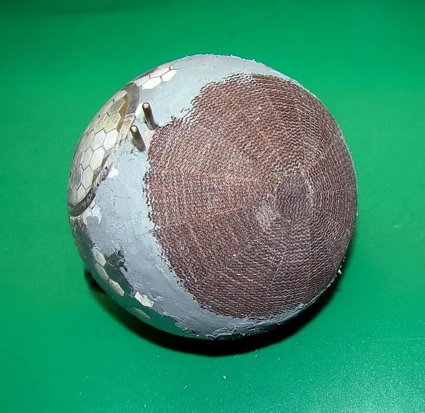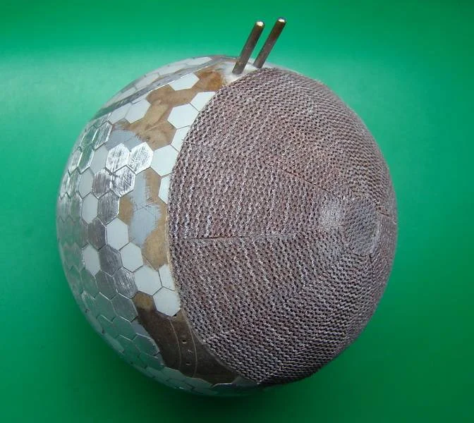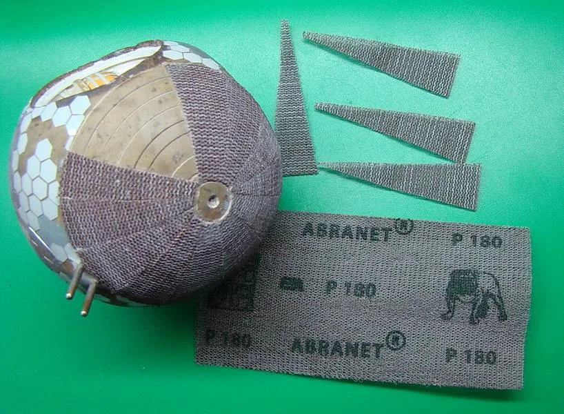 Пока делал операции с ракетоносителем, по ходу дела соображал , как бы получить на шарике спускаемого аппарата натуралистическую картинку пористой выжженой асборезины, покрывающей спускаемый аппарат и имеющий самый толстый слой в закресельном отделе СА. Все пространство за креслом космонавта напичкано тяжелой аппаратурой поддержания микроклимата в корабле, аккумуляторами и прочими "тяжестями". Это сделано еще и с той целью, чтобы при сходе с орбиты и полете в атмосфере шар не вращался произвольно, а летел вперед устойчиво при помощи смещенного центра тяжести. Соответственно и эта зона шара, как наиболее термонагруженная , имела и соответствующую термозащиту толщиной в 18 см, в то время, как противоположная часть шара имела термозащиту толщиной в 5 см. На фото приземлившихся СА видно, как обгорала их поверхность. В конечном итоге для имитации пористого слоя выжженой асборезины я взял шлифовальную ленту ABRANET, представляющую собой мелкоячеистую синтетическую сетку с напыленным абразивом. Нарезав треугольников из ленты, наклеил их на поверхность шара при помощи цианоакрила, затем шпаклевкой ТАМИЯ выровнял ступеньку между наклеенными ранее шестигранниками и шлиф.лентой. После сушки шпаклевки прошкурю поверхность и буду соображать, что делать дальше - как производить окраску шарика.