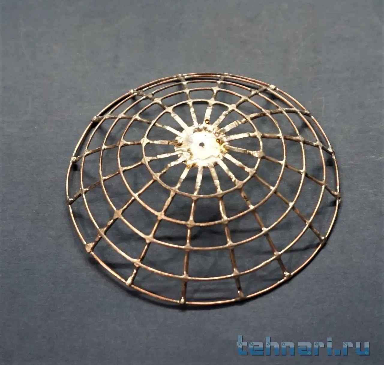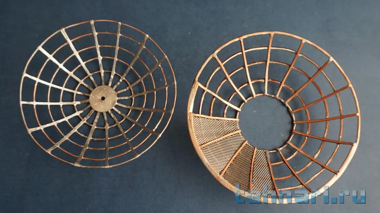 Думать долго не пришлось, в кухне на глаза попалось маленькое ситечко с металлической сеткой нужного мне размера. Оно тут же было реквизировано и прошло срочную примерку к каркасу антенна радиолокационного прицела. Совместимость оказалась идеальной и судьба ситечка была предрешена. Сетка была предварительно зачищена шкуркой, промыта, а затем аккуратно освобождена от ручки и окантовки. После чего сетка была вставлена в каркас антенны и начались паяльные работы. По окончании пайки излишки сетки по контуру антенны были срезаны, места пайки подвергнуты механической обработке напильником и зачистке шкуркой.