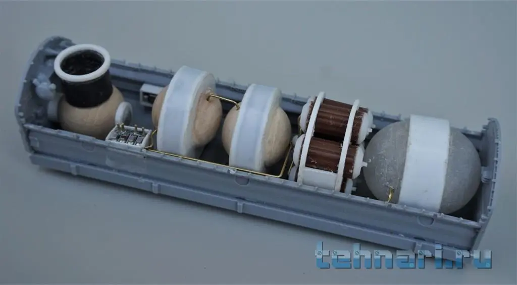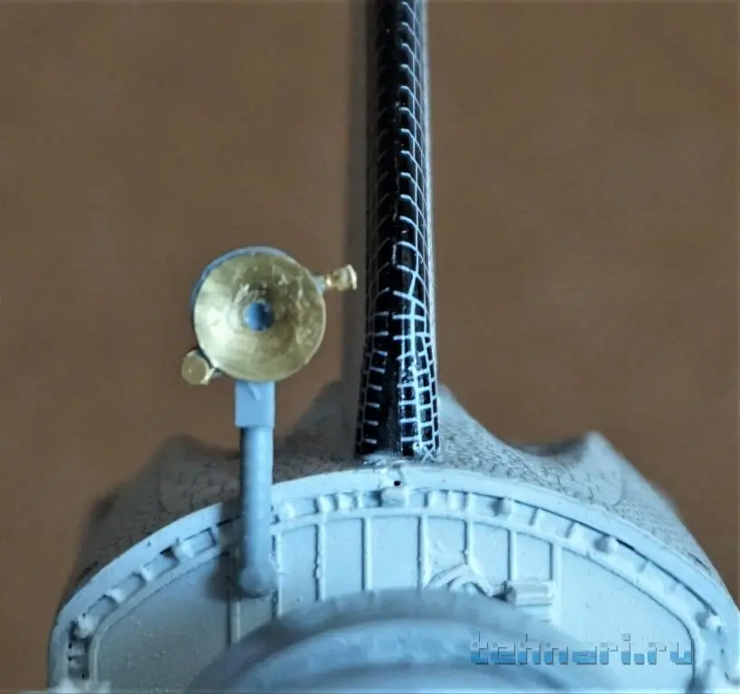 Осталось доделать различную "мелочевку" и установить ее на модель. К ним относятся радиолокаторы, размещенные в грузовой кабине и днище корабля. Детали из коробки дополняем элементами фотоэчета.