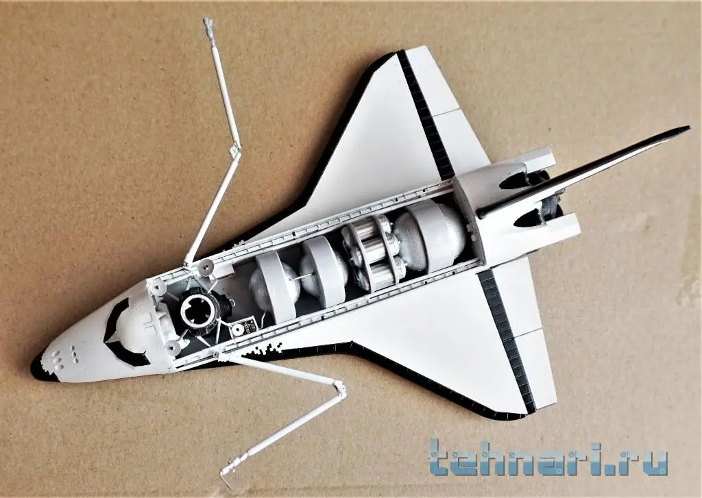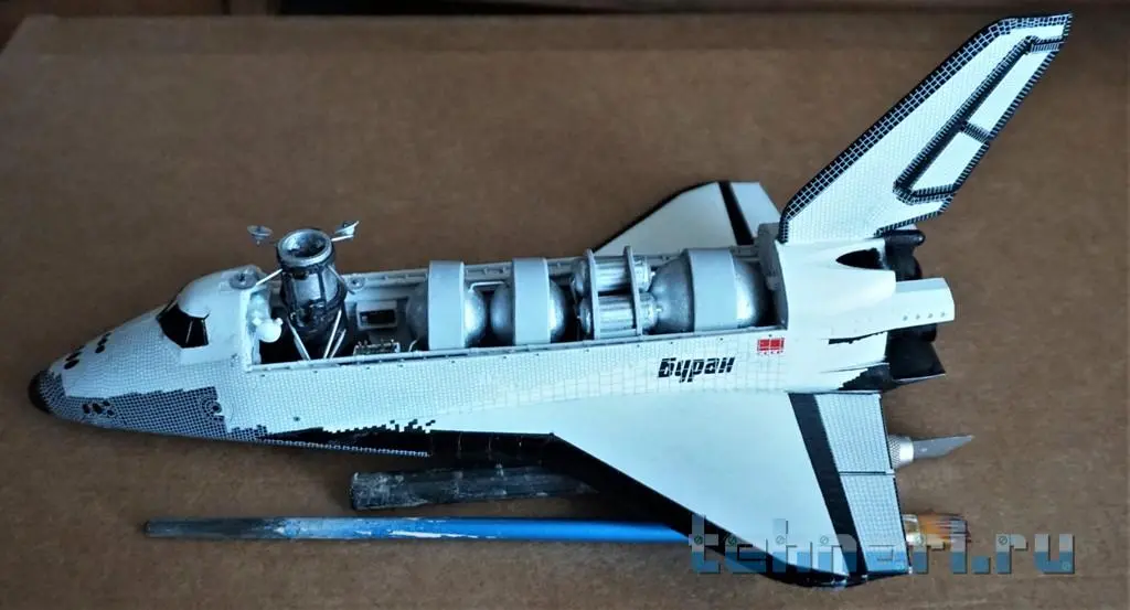 На внутренней стороне створок, закрывающих грузовой отсек, размещаем солнечные панели, выполненные фотопечатью на бумаге. На внешнюю сторону створок наносим декаль с плиточным покрытием. После чего створки устанавливаются на свои штатные места на фюзеляже, при этом первые две створки с обеих сторон выставляются в приоткрытом состоянии.