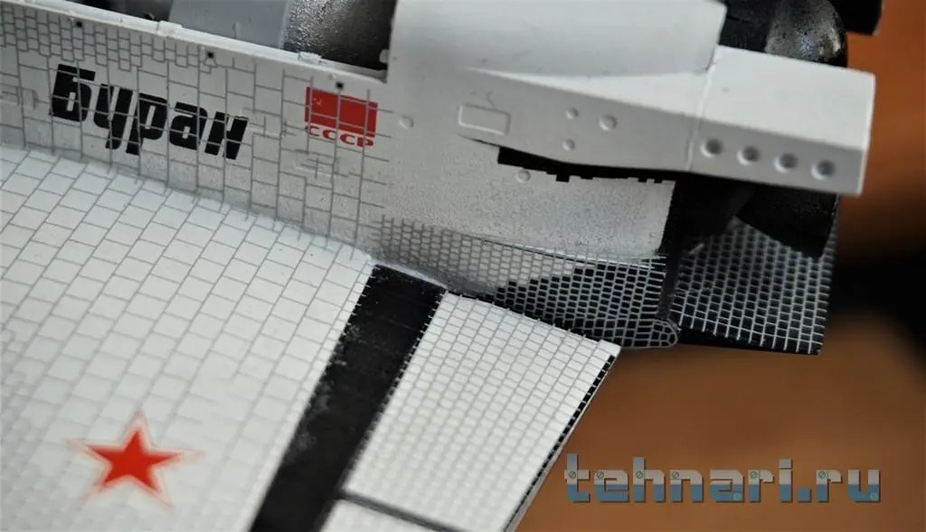 А теперь можно приступать к нанесению декалей на корпус "Бурана". Фирма "Бегемот" выпустила прекрасную декаль для оформления модели "Бурана" от ARK, на которой в объеме выполнены многочисленные плитки теплозащиты корабля, чего невозможно было сделать в литье.