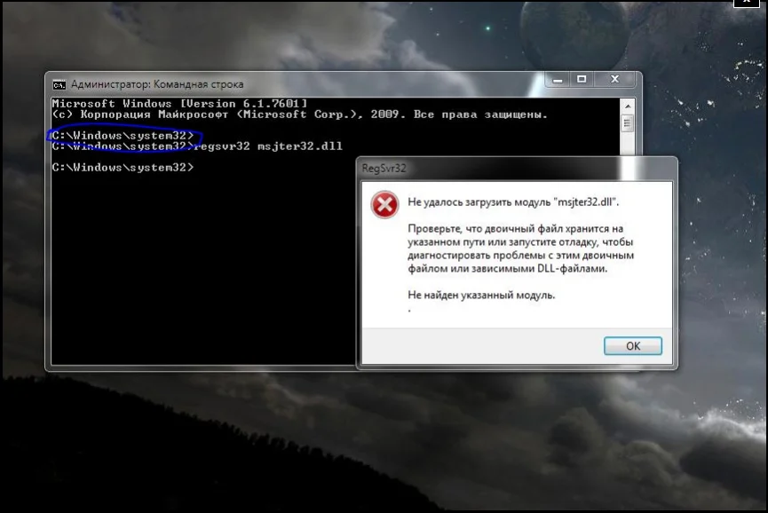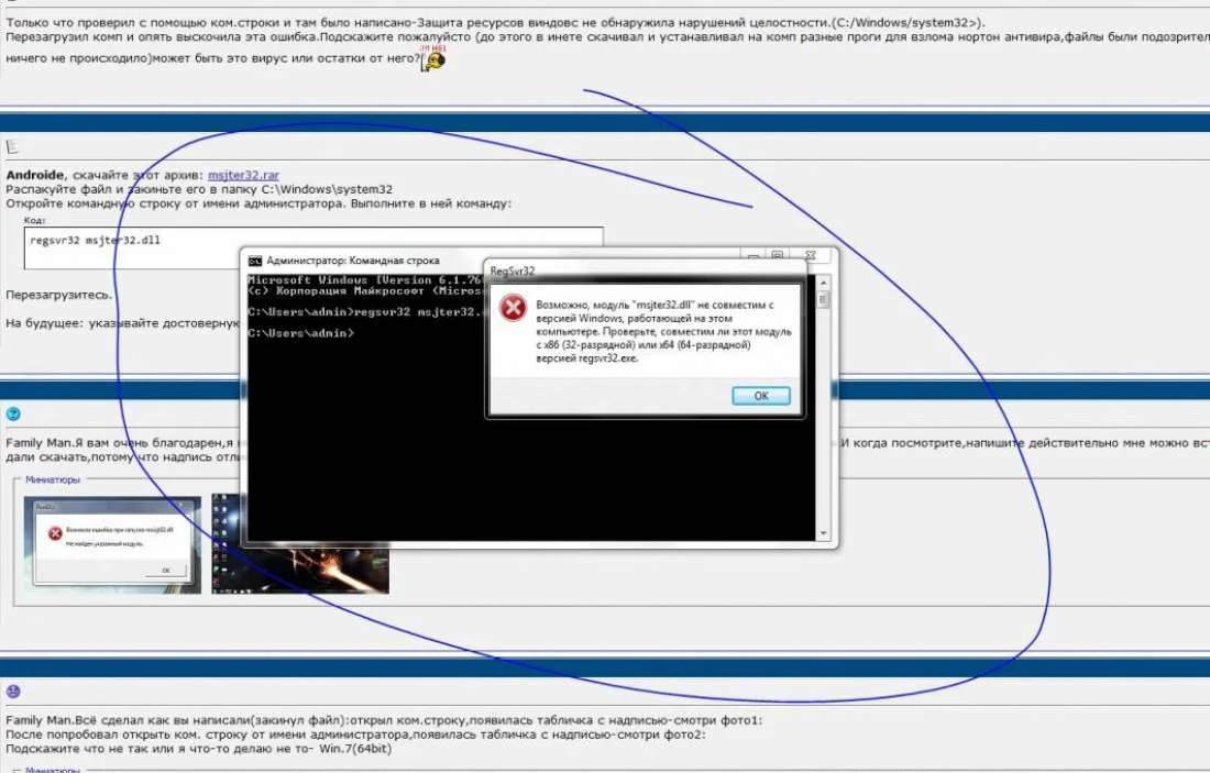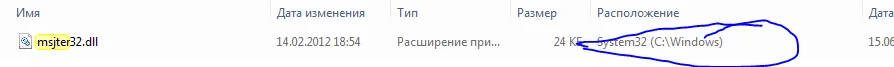 Похоже что вирус подменил оригинальный системный файл msjter32.dll вашим msitia32.dll. Читайте внимательно и полностью тему: http://www.tehnari.ru/f76/t64051/