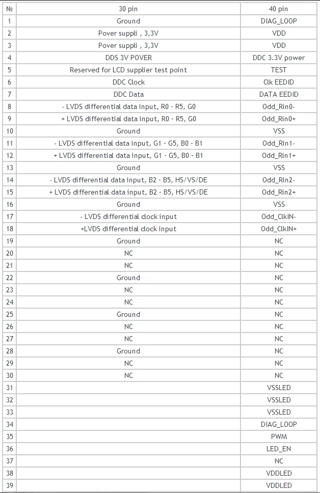 Взгляните на скрин. Это распиновка 30-ти пинового разъема для матрицы B156XW01 v.2 30pin. Какие концы и на какие ножки аналогового разъема сажать, чтобы монитор получил сигнал? Где тут-что не разумею. Может так и решу проблему.