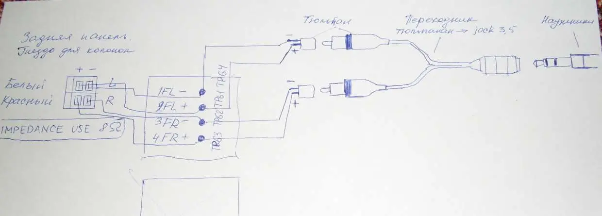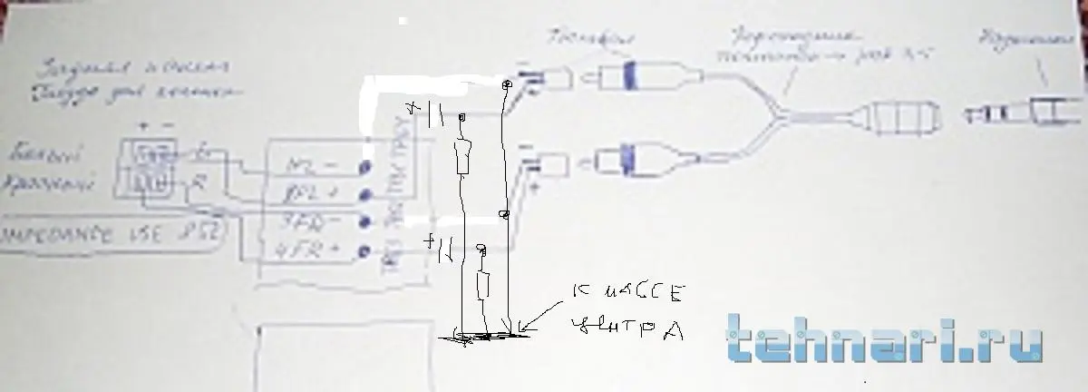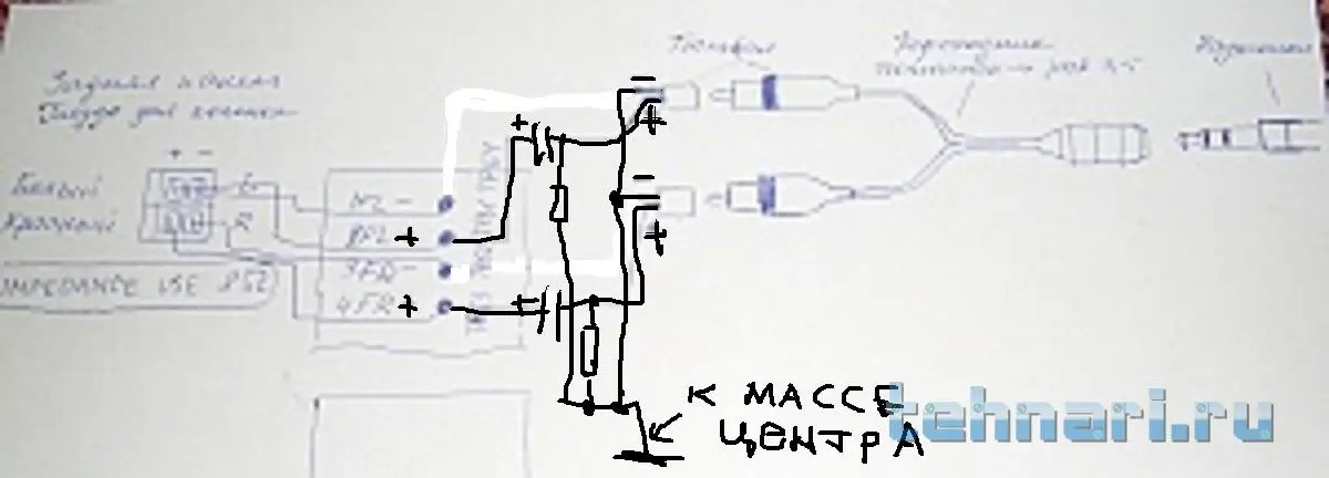 Плюсы наушников через ёмкости, соблюдая полярность, подсоединяем к плюсовым выходам центра. Каждый наушник к соответствующему каналу.