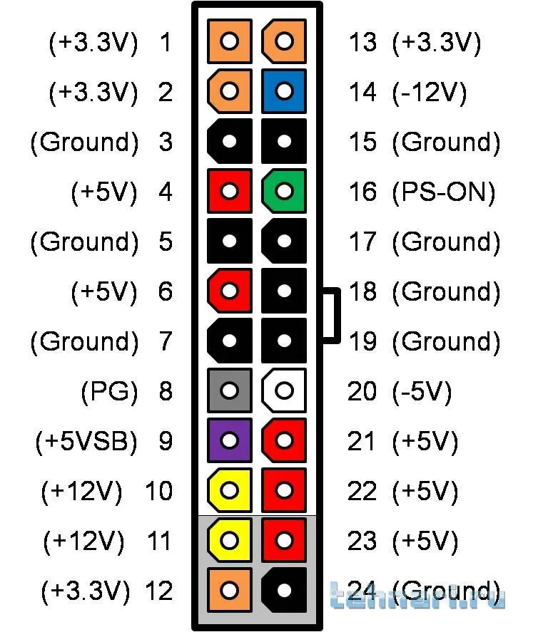 Сначала надо убедится в наличии всех напряжений на разъеме , в том числе и отрицательных , по сути материнка должна закоротить зеленый провод на массу .