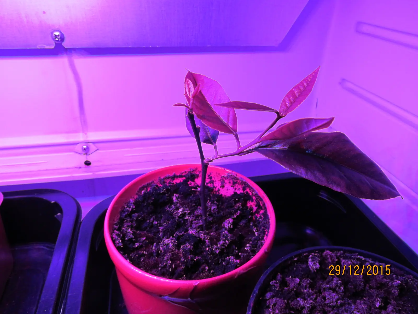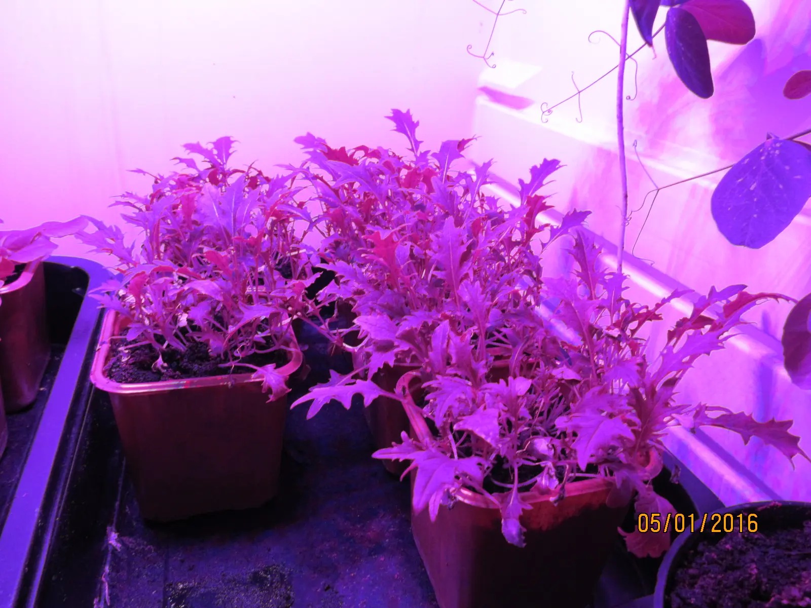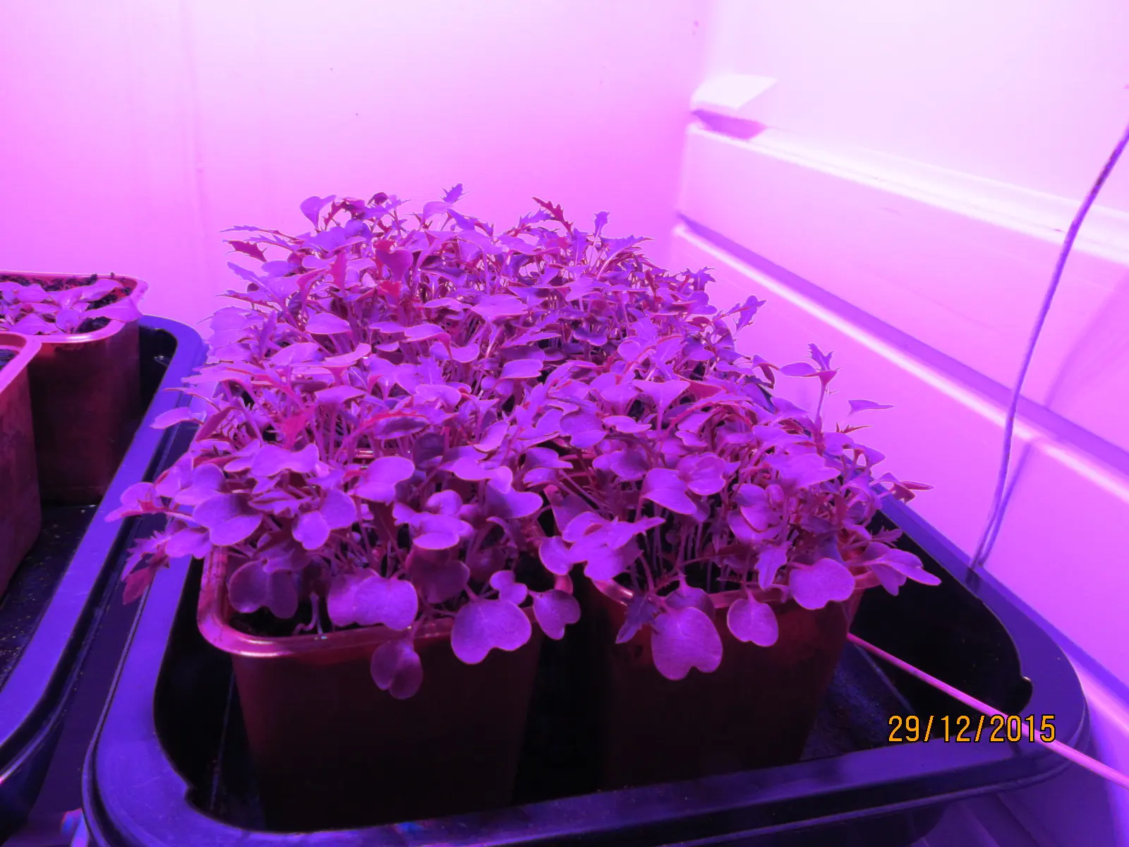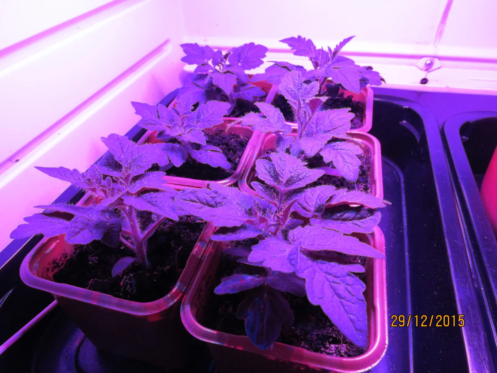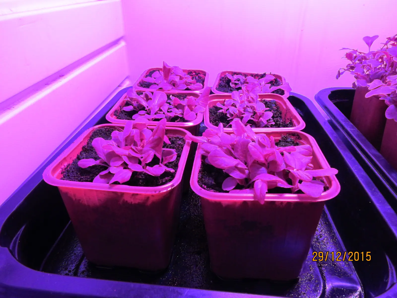 Для этого я сделал две светодиодные лампы по 21 ватту одну лампу на одну полку . В холодильнике у меня растет лимон из черенка ,помидоры черри ,горох \ он тестирует светильник\ и два вида салата . Лампы стоят на таймере включаются в 7 утра и выключаются в 21 вечера. Автоматику еще не сделал и приходится самому дверь холодильника закрывать вечером и открывать утром иначе температура заходит за 30 градусов .Один светильник с кулером а второй без него . Синих в этих светильниках больше чем красных.