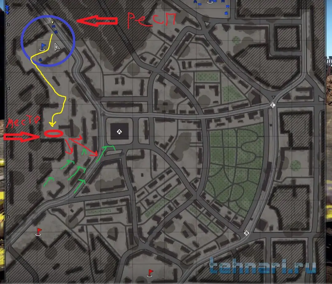 вот нарисовал , респ , жёлтым куда ехать , красным -точку , маленькие красные - направления обстрела , зелёные откуда попрёт враг)))))