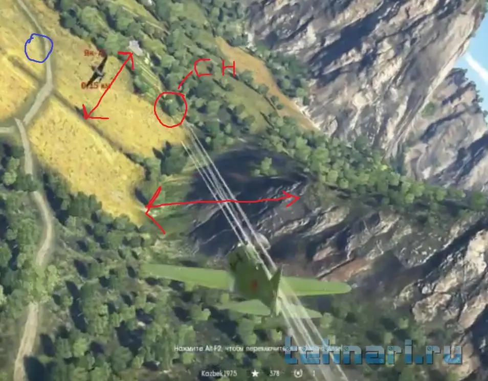 именно находишься не в плоскости того самолёта, а если летишь не не вираже и находишься на шести, то стреляешь выше или ниже кружка , чаще выше, чтоб снаряд ложился на самик, , Як9т когдв выкачаешь , то увидишь сам что придётся накладывать выстрелы навесом