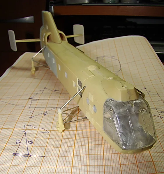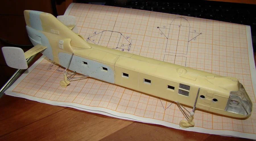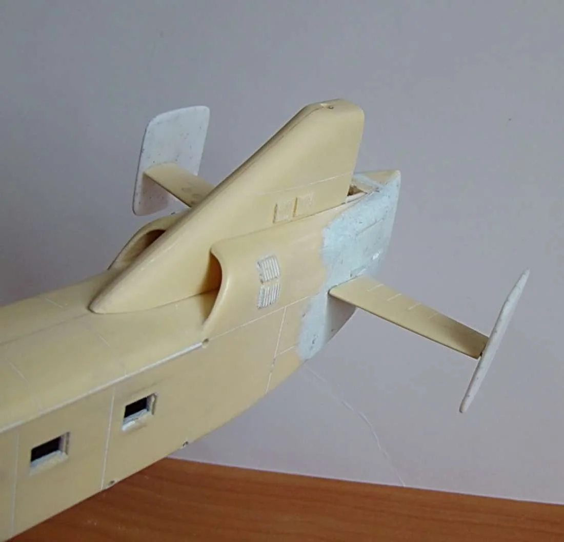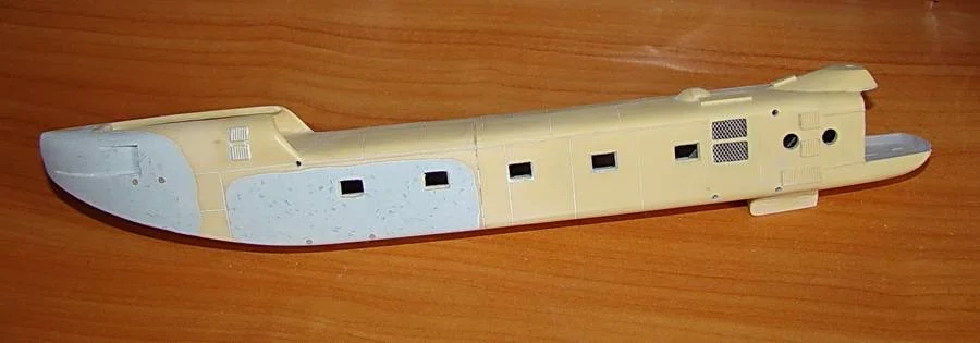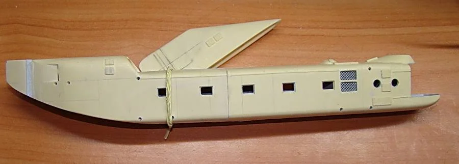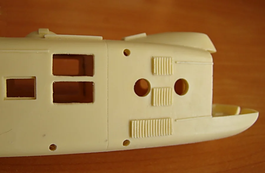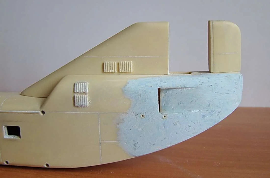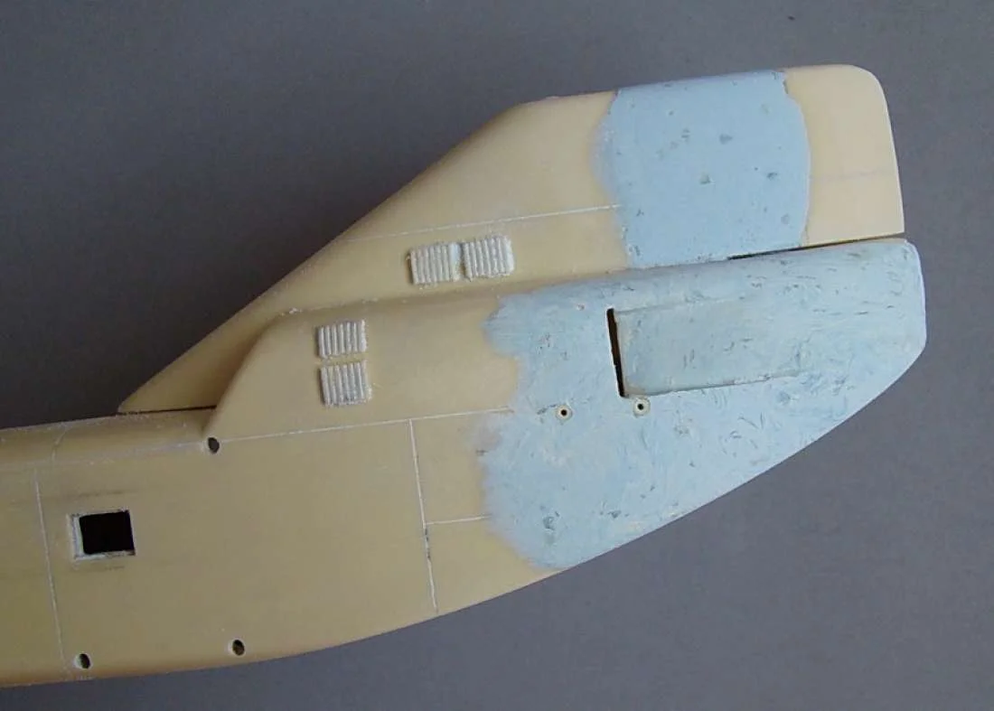 Рассматривая фото данного вертолета с № 35, я обратил внимание, что на одном из снимков хорошо просматривается днище фюзеляжа и его хвостовая часть не имеет характерного изогнутого окончания, хотя об этом изменении информации я так и не нашел. Везде пишут только о стабилизаторе и шайбах. Но если на фото данное изменение зафиксировано, то будем руководствоваться им.Добавится только объем конверсионной работы, но это даже интереснее. Для начала сделал то же, что и в предыдущей модели- прорезал отсутствующие окна охлаждения носового двигателя, установил в них решетки.