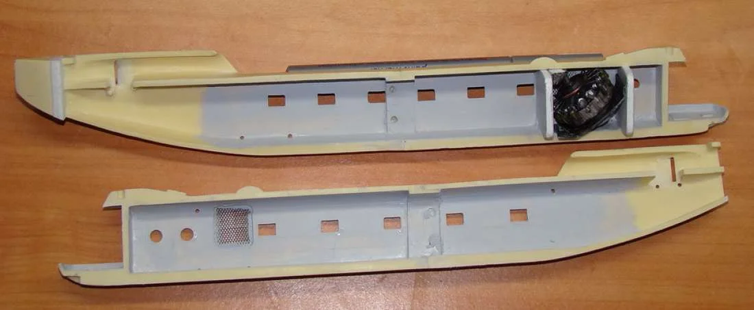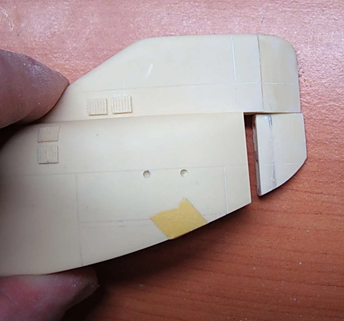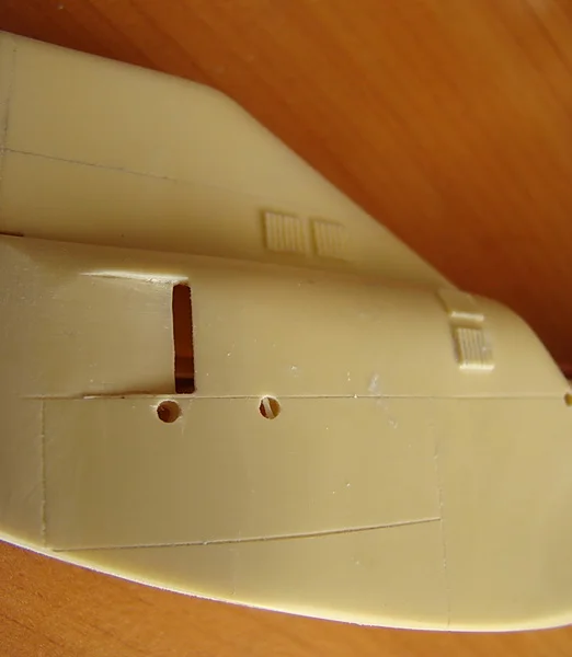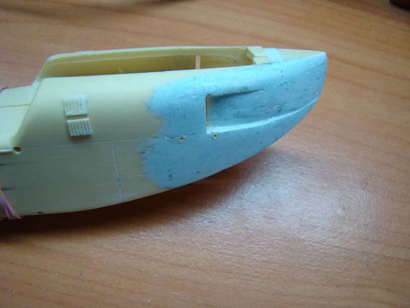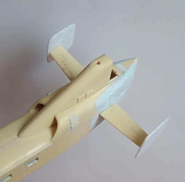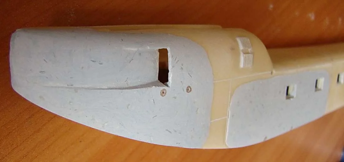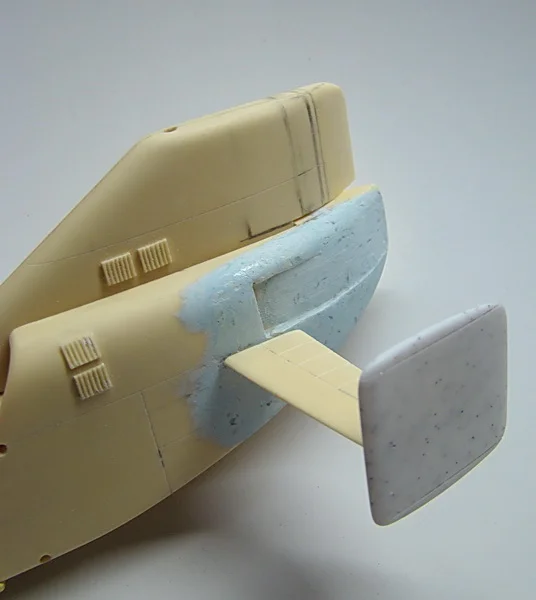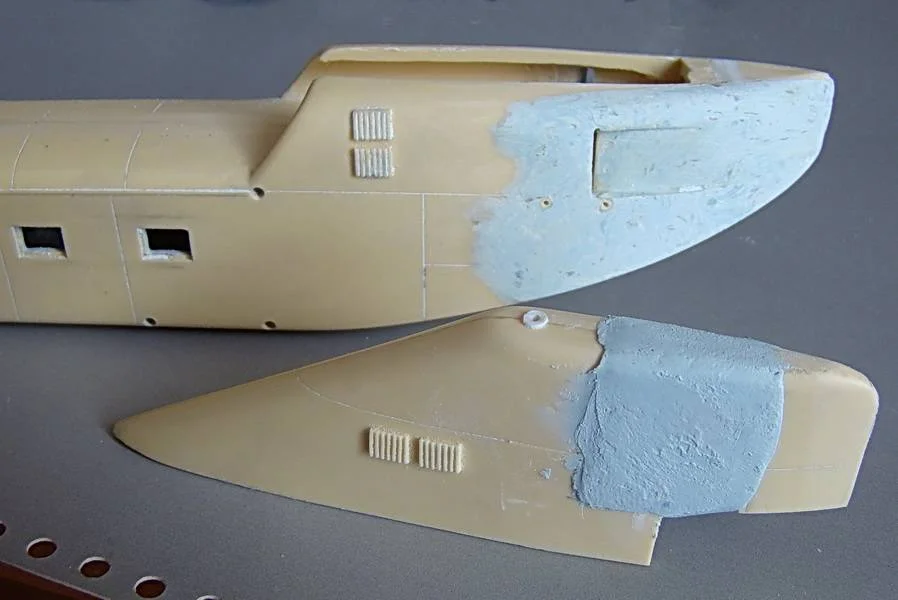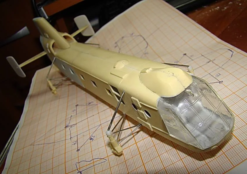 Рассматривая фото данного вертолета с № 35, я обратил внимание, что на одном из снимков хорошо просматривается днище фюзеляжа и его хвостовая часть не имеет характерного изогнутого окончания, хотя об этом изменении информации я так и не нашел. Везде пишут только о стабилизаторе и шайбах. Но если на фото данное изменение зафиксировано, то будем руководствоваться им.Добавится только объем конверсионной работы, но это даже интереснее. Для начала сделал то же, что и в предыдущей модели- прорезал отсутствующие окна охлаждения носового двигателя, установил в них решетки.