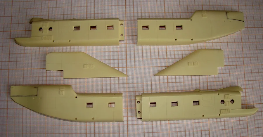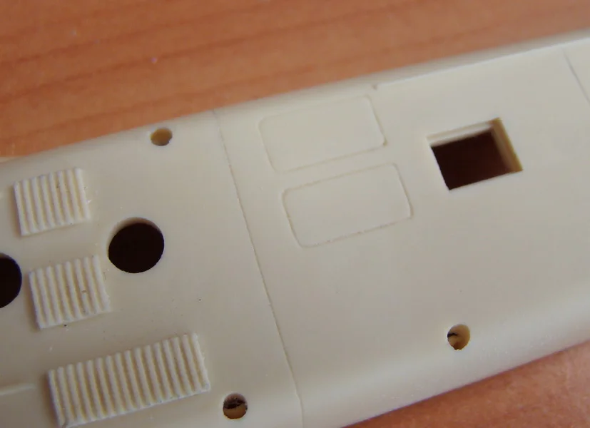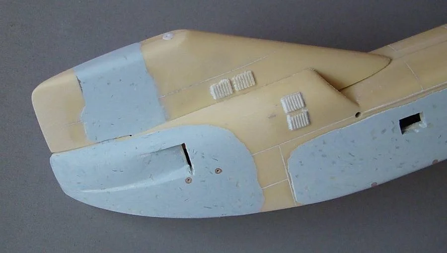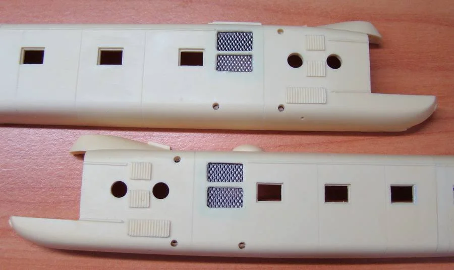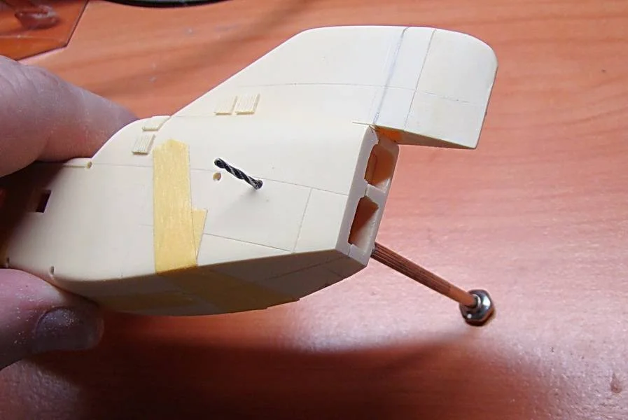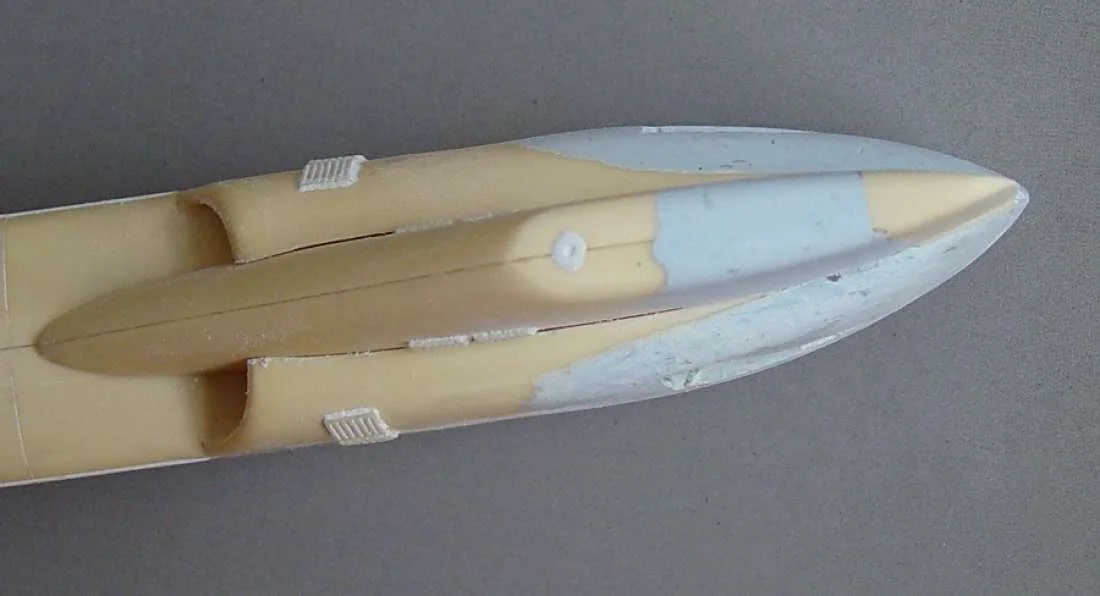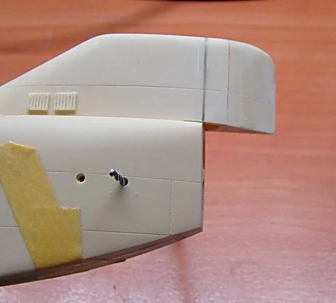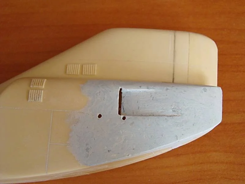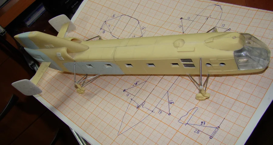 Рассматривая фото данного вертолета с № 35, я обратил внимание, что на одном из снимков хорошо просматривается днище фюзеляжа и его хвостовая часть не имеет характерного изогнутого окончания, хотя об этом изменении информации я так и не нашел. Везде пишут только о стабилизаторе и шайбах. Но если на фото данное изменение зафиксировано, то будем руководствоваться им.Добавится только объем конверсионной работы, но это даже интереснее. Для начала сделал то же, что и в предыдущей модели- прорезал отсутствующие окна охлаждения носового двигателя, установил в них решетки.