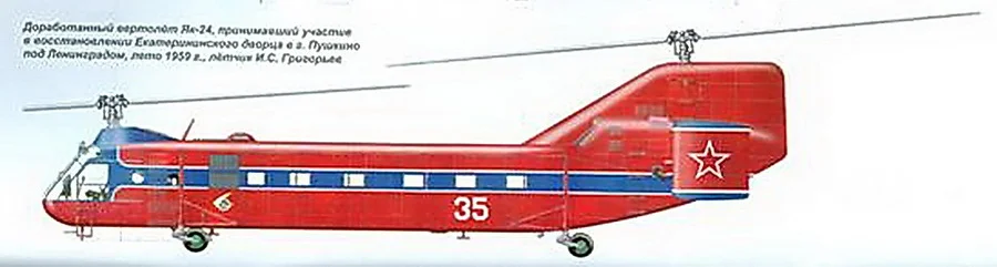 Летом 1959г. Як-24 ( с бортовым номером 35) привлекали для реставрации Екатерининского дворца в г. Пушкино под Ленинградом. На этой машине были выполнены все доработки, аналогичные Як-24У, кроме расширения фюзеляжа.