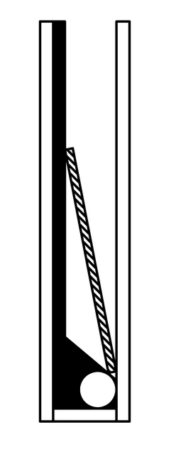 В емкость вклеиваются несколько вертикальных планок. На чертеже их профиль выполнен черной заливкой. Нижний скос обеспечит смещение ПП к краю. А вертикальная часть не даст плате упасть на стекло и перекрыть движение жидкости.