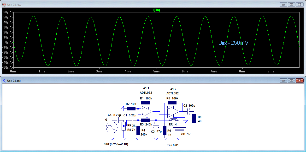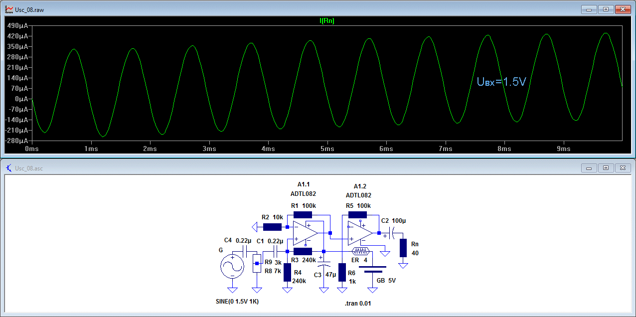 Не совсем ясно корректно ли симулятор микросхему понял, но если обратиться к официальному документу, то все и так понятно: никаких 0.01 % гармоник 2822 даже в самом сладком сне не даст. И еще эта микросхема имеет огромный фикисированный Ку от которого больше вреда чем пользы.Работает при малых входных напряжениях, до 100 mV. Потробовал дать половину выхода телефонки 500 mV и он сдох
