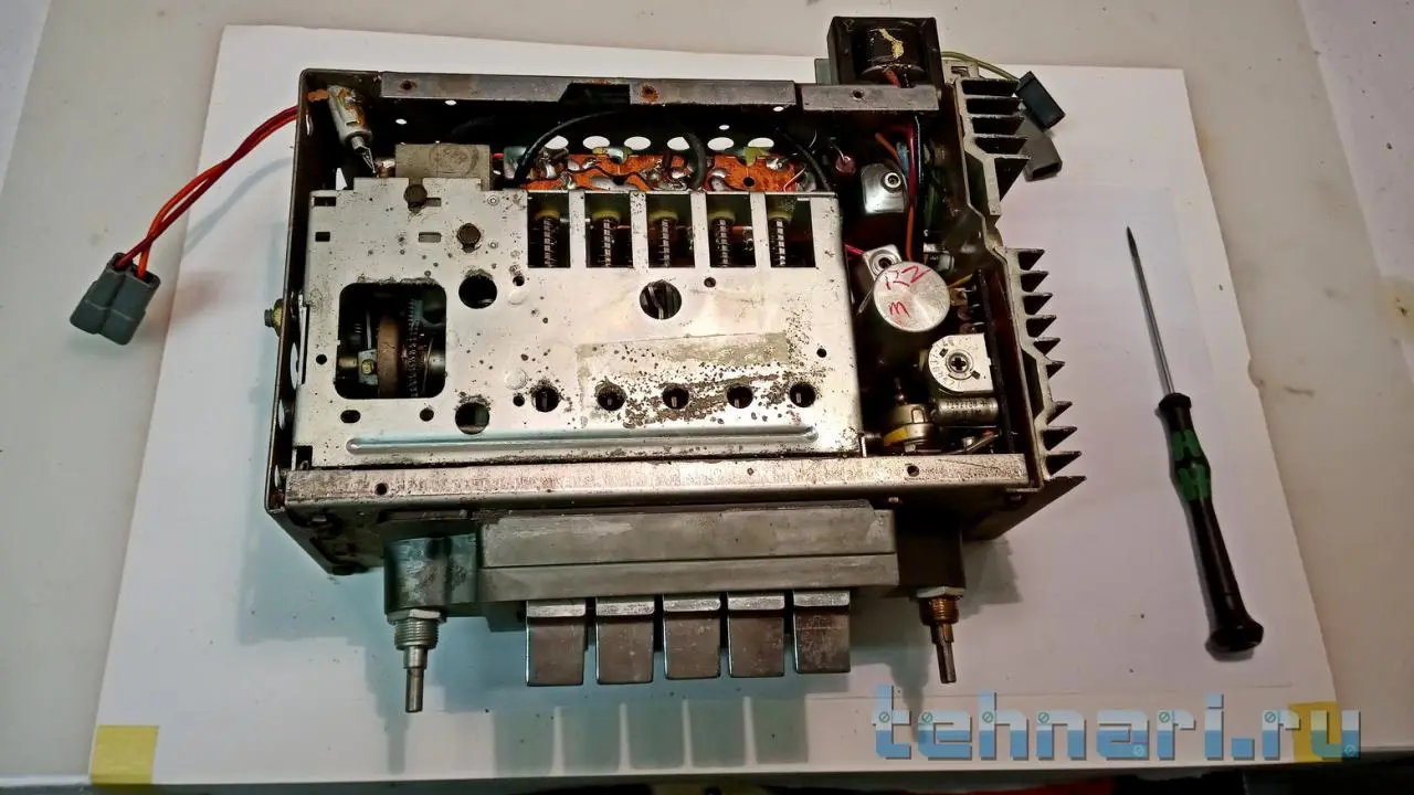 Прислан на ремонт, от автомобиля Кадиллак 60х годов прошлого века, транзисторный, диапазоны СВ и ФМ. Молчит, значит начнем с проверки цепей питания и затем УНЧ. Унч собран всего на 4 транзисторах с прямыми гальваническими связями, однотактный, с трансформаторным (точнее - автотрансформаторным) выходом на головку 4 Ом. Выходной транзистор ,(DC -501) в обрыве по всем направлениям. По согласованию с владельцем заменил DC-501 на более мощный и современный B 688, смонтировав его на отдельный радиатор и спрятав эту лабуду внутрь корпуса. Вот и весь ремонт. ))