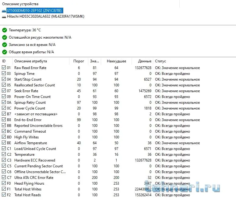 Хитачи в норме, сегейт в неважном состоянии. Почистить контакты на плате контроллера ластиком до блеска, если атрибуты по С3 не изменятся, возможно проблема с БМГ или поверхностью диска.