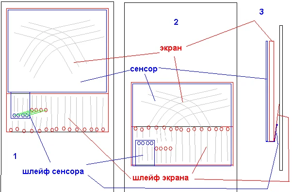 шлейф сенсора немного перекрывает контакты на шлейфе экрана (на рисунке чуть не точно нарисовано)