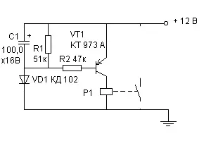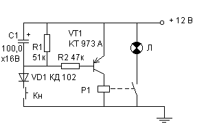 Реле Р1 (из монтажного блока) вставляется в клеммы, применяемые в автомобильной проводке, впаянные в плату. Провод от кнопок дверей Кн. отключается от лампы и подключается к диоду VD1. Лампа Л. подключается к контактной группе реле Р1. Время задержки в секундах можно оценить по формуле: