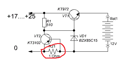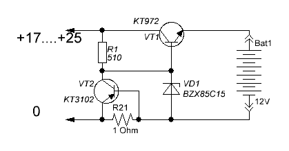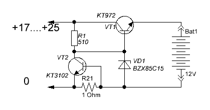VT1 - ключевой, VT2 - регулирующий и участвующий в обратной связи. А вот вместо стабилитрона лично я бы поставил что-нибудь регулируемое, ещё немного усложнив схему, но сделав возможность плавной регулировки выходного напряжения. Резистор можно подбирать, а можно параллельно ему поставить переменный резистор на несколько килоом и снимать напряжение на базу VT2 с движка этого переменника, тогда можно будет оперативно и плавно регулировать выходной ток устройства. КТ3102 - составной транзистор с большим коэффициентом усиления, так что такой вариант должен работать вполне приемлемо.