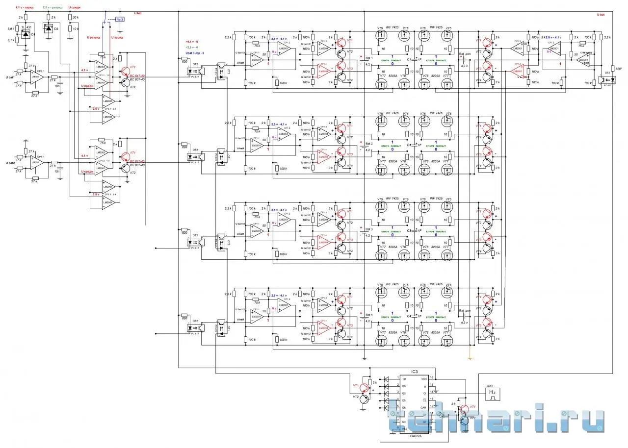 В батарее стоит 4 последовательных банки.При помощи блока управления напряжение на каждой банке аккумулятора сравнивается со средним напряжением банки.В режиме разрядки аккумулятора если напряжение на банке меньше средней величины напряжения на банке включается соответствующий блок и данная банка дозаряжается до уровня U среднее.