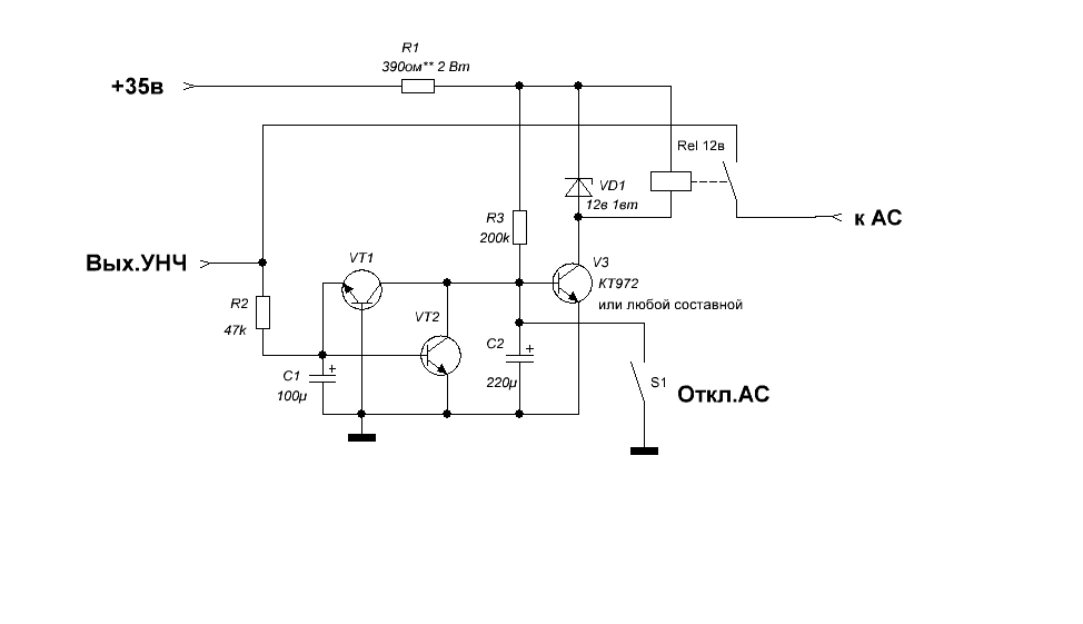 Cобрал защиту для саба по данной схеме,стабилитрон выполняет двойную функцию.
