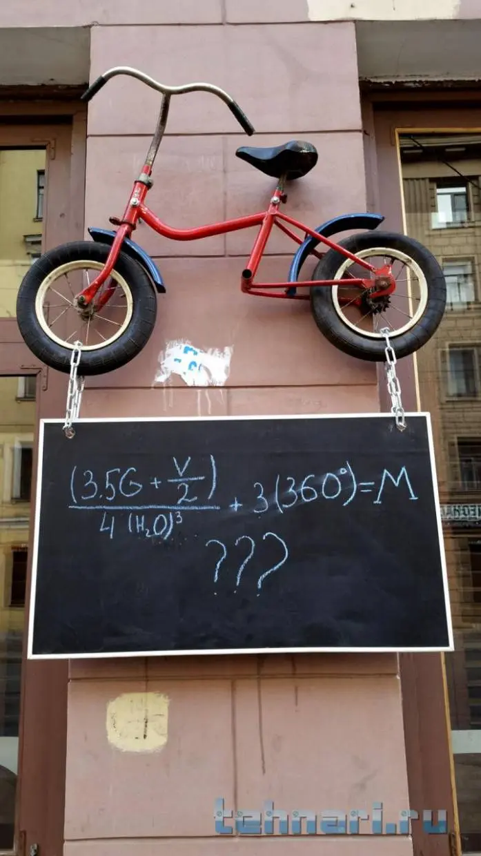 Намек на то, что рожденный ползать, в данном случае его символизирует велосипед, летать не может и, какую бы скорость он не развил, все равно придется упасть. И доска с доказательствами этого закона является якорем для мечтающих взлететь.В верхней части дроби явная отсылка к скорости и ускорению свободного падения