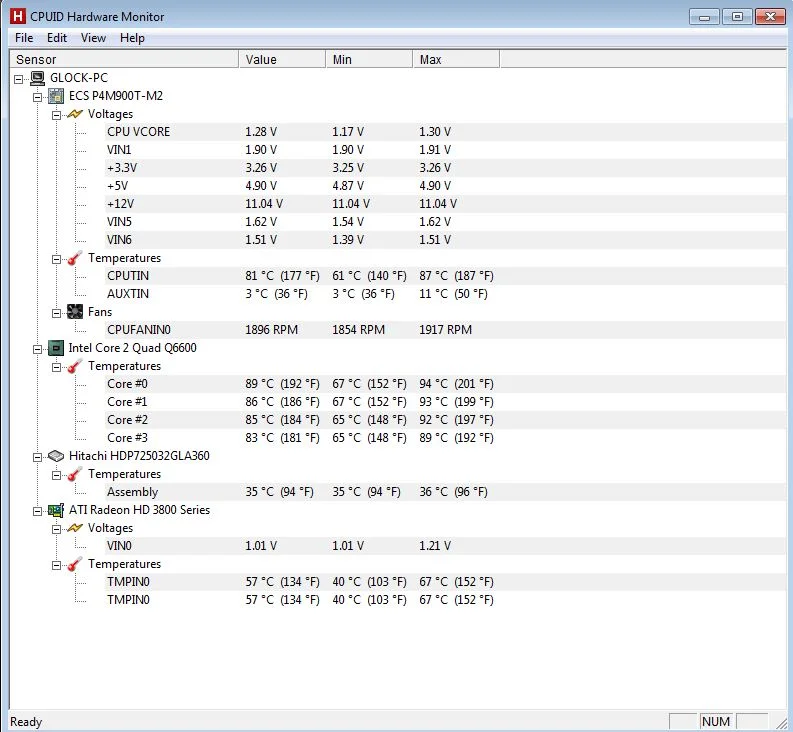 Всем привет,с недавнего времени комп стал зависать во время игр.Зависает намертво т.е помогает только рессет.Скрин после работы в 3D Mark 06 ,измеряно CPUID Hardware Monitor.Видно что температуры процессора высокие.Из за чего это может быть,и какие мои действия дальше.