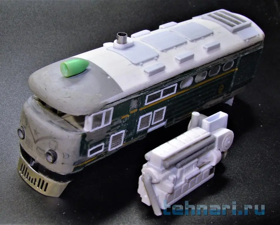 И снова вернулся на крышу. Наклеил крышки-люки, вырезанные из листового пластика, снабдил их подобием шарниров, нарезанных из того же пластика и занялся изготовлением вентиляционных устройств, установленных на крыше. Все детали этих устройств выполнены также из листового пластика с последующей обработкой при помощи напильника. Готовые вентиляционные устройства заняли свои штатные места, а я занялся изготовлением выхлопной трубы дизеля . Для этого понадобились кусочки листового пластика и трубка соответствующего диаметра от антенны. В конечном итоге и выхлопная труба заняла свое штатное место.