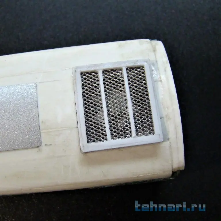 Эту же сетку от картриджа устанавливаю и на большие вентиляционные окна, расположенные по обеим бортам корпуса тепловоза. Рамку на окна вырезал из крышки от Доширака. На узкие, мелкие окна буду подбирать другую сетку.
