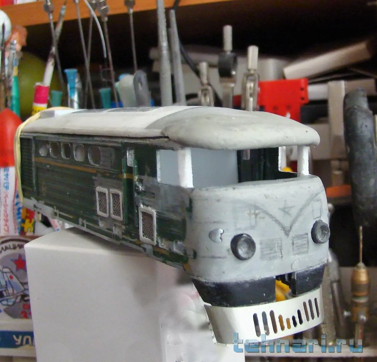 Лицо локомотива обрастает новыми деталями. На сей раз это метельник. В качестве основания под него послужил метельник от модели-донора, который пришлось разрезать пополам и несколько срезать по высоте, ориентируясь на масштабные размеры , взятые с чертежа локомотива. Полученный в результате разрезки и установки основания метельника на корпус модели зазор ничем заполнять нет необходимости, поскольку в данный зазор будет устанавливаться автосцепка.