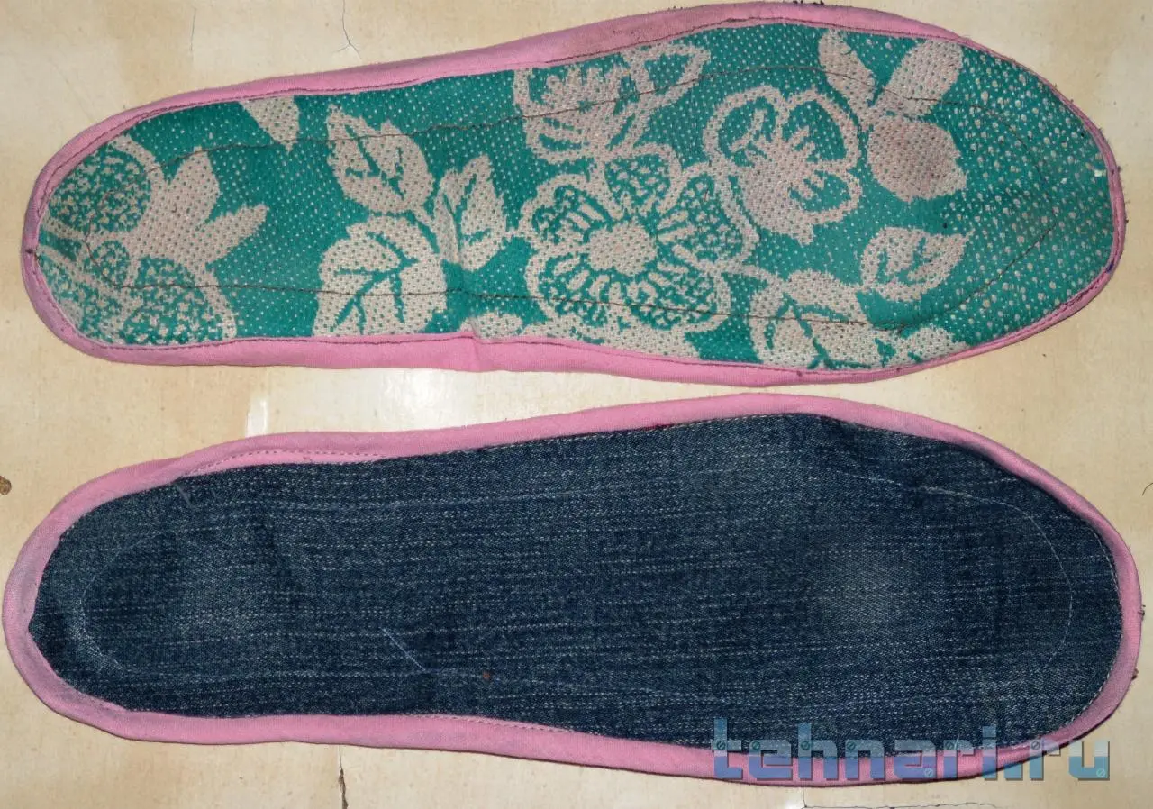 А основу для жесткости ставил какую нить? Или они мягкие получаются, у меня если мягкие, скомкиваются через некоторое время.Стельки очень просты- два- три слоя старой джинсы или подобного чисто х/б материала. Просто сшить вместе удобным способом.