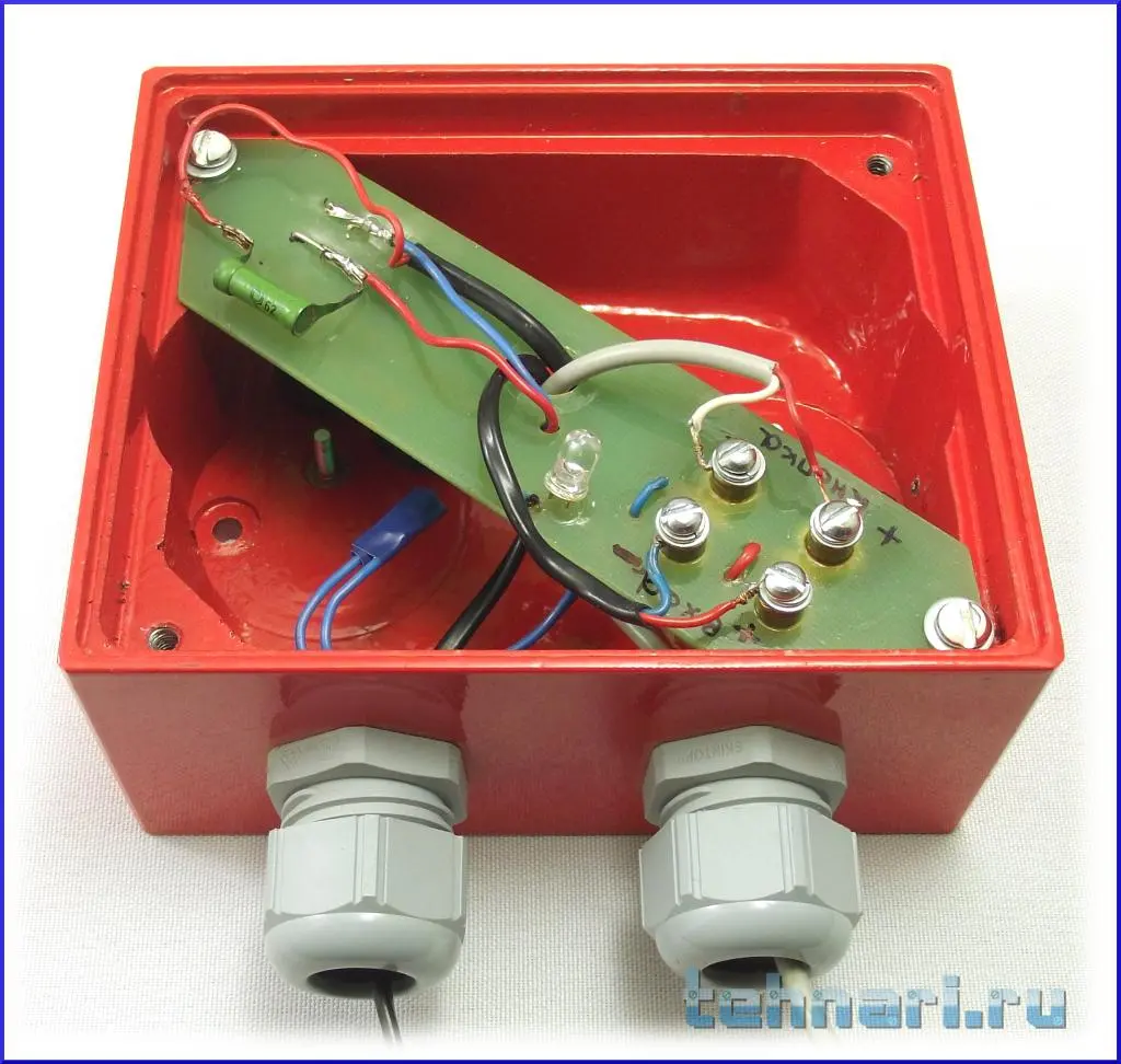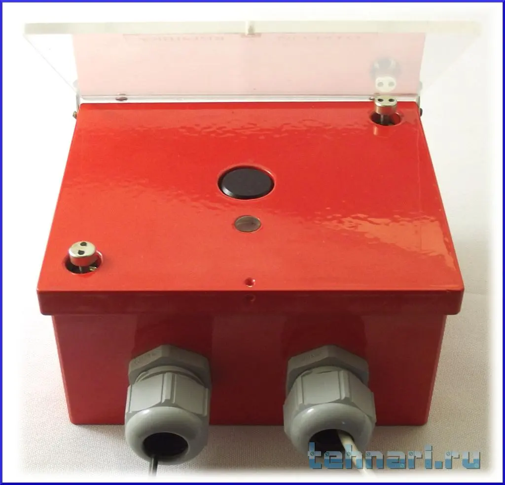 Приятель подарил пожарную кнопку, так что все детали очень красиво в ней разместились. На плате пожарной кнопки был светодиод. Я его оставил в надежде подключить. Понимаю, что напряжение 40 В не очень подходящее для светодиода, попозже научусь их подключать и ОБЯЗАТЕЛЬНО подключу.
