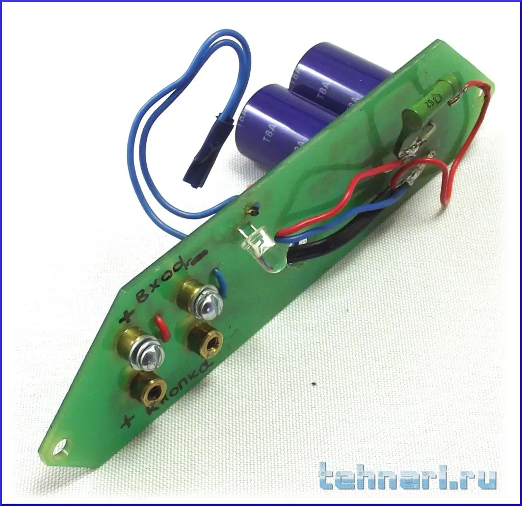 Паузу в 20 секунд обеспечивает резистор 1,2 кОм. Оказалось, что паузу можно было делать и меньшей, секунд в 10. Дело в том, что если кнопку нажимать раньше, скажем секунд через 5 или 10, то конденсаторы сбрасывают свой заряд и весь цикл начинается сначала ... Так что особо ретивые гости, чем чаще будут нажимать на кнопку, тем реже услышат звук рынды. Если найду мощный резистор на 0,7 - 0.9 кОм, то заменю. Но меня "угнетает" тот факт, что если нажать на кнопку и НАХАЛЬНО держать её нажатой, то резистор всё же нагревается. Дольше 30 секунд я не экспериментировал, но уверен что найдутся уникумы, которые могут давить на кнопку гораздо дольше. Не сгорит ли чего???